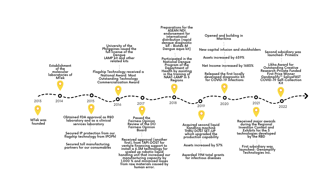 Manila HealthTek, Inc. (MTek, Inc.) is the first of its kind in the Philippines. It is principally a private Research and Development company with a robust diagnostic technology pipeline. As a first ever university spin-off from the University of the Philippines, it will develop and manufacture portable diagnostic kits for the diagnosis of selected infectious diseases in the Philippines and in the region. MTek, Inc. recognizes the potential of the isothermal platform and other emerging biotechnologies to be utilized in designing novel and quality point-of-care diagnostic kits that are as rapid and accurate as the most advanced molecular diagnostic tools available in the market, yet affordable to a majority of low-to-middle income Filipino patients who are mostly the ones afflicted with infectious diseases. As such, MTek, Inc. hopes to help in reducing the burden of infectious diseases by providing timely diagnostic intervention through affordable, simple yet accurate technologies. Moreover, scale-up manufacturing and commercialization of an array of diagnostic kits in the product pipeline provides an excellent opportunity to contribute to the macroeconomic growth of the country. The company is founded and managed by highly-trained and multi-awarded Filipino scientists and experienced partner-entrepreneurs. We will likewise be the home of similar Filipino scientists who will be at the forefront of science and research in the region without having to leave the country.